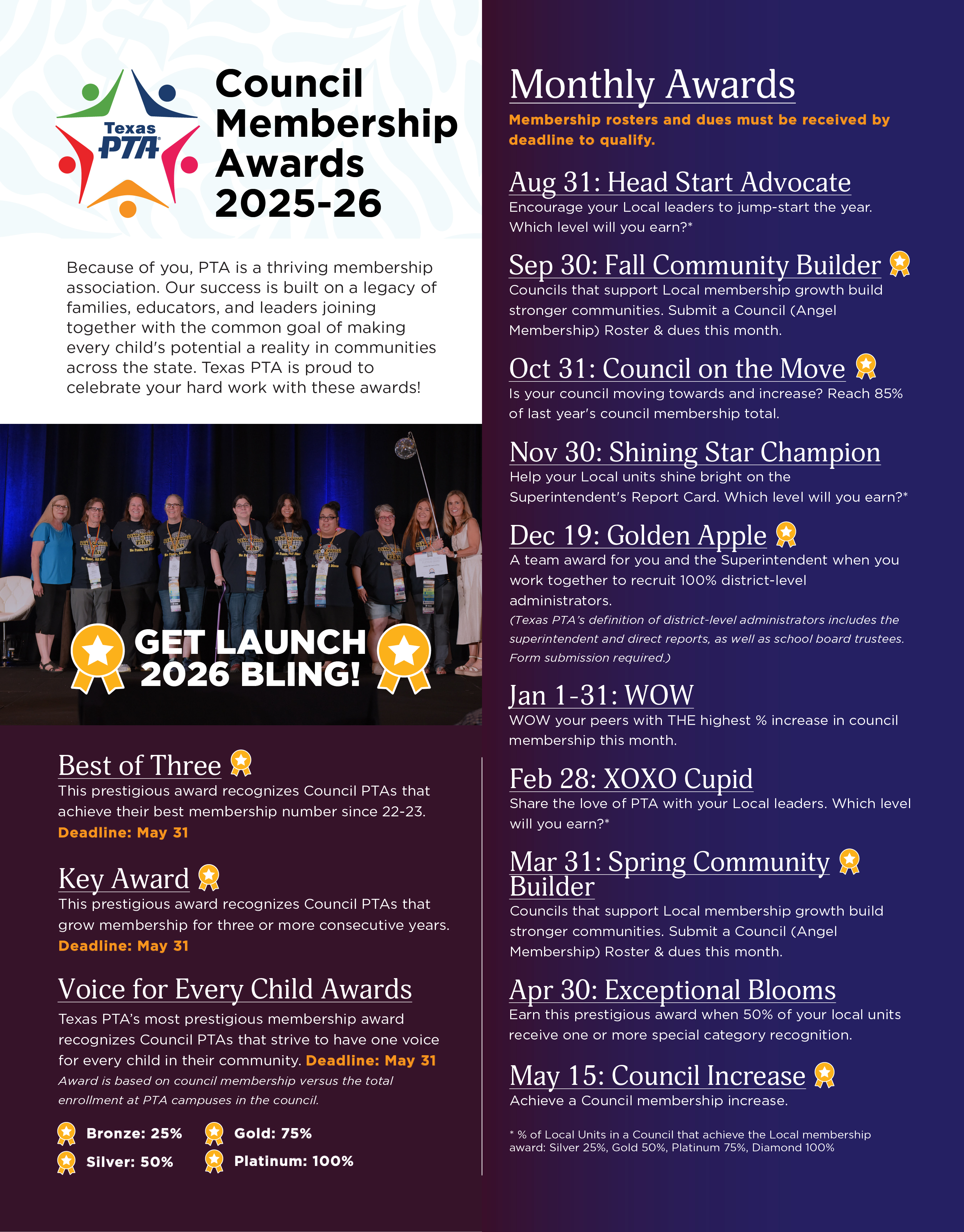 All monthly membership awards are automatically calculated based on the Local PTA’s membership totals at each deadline.