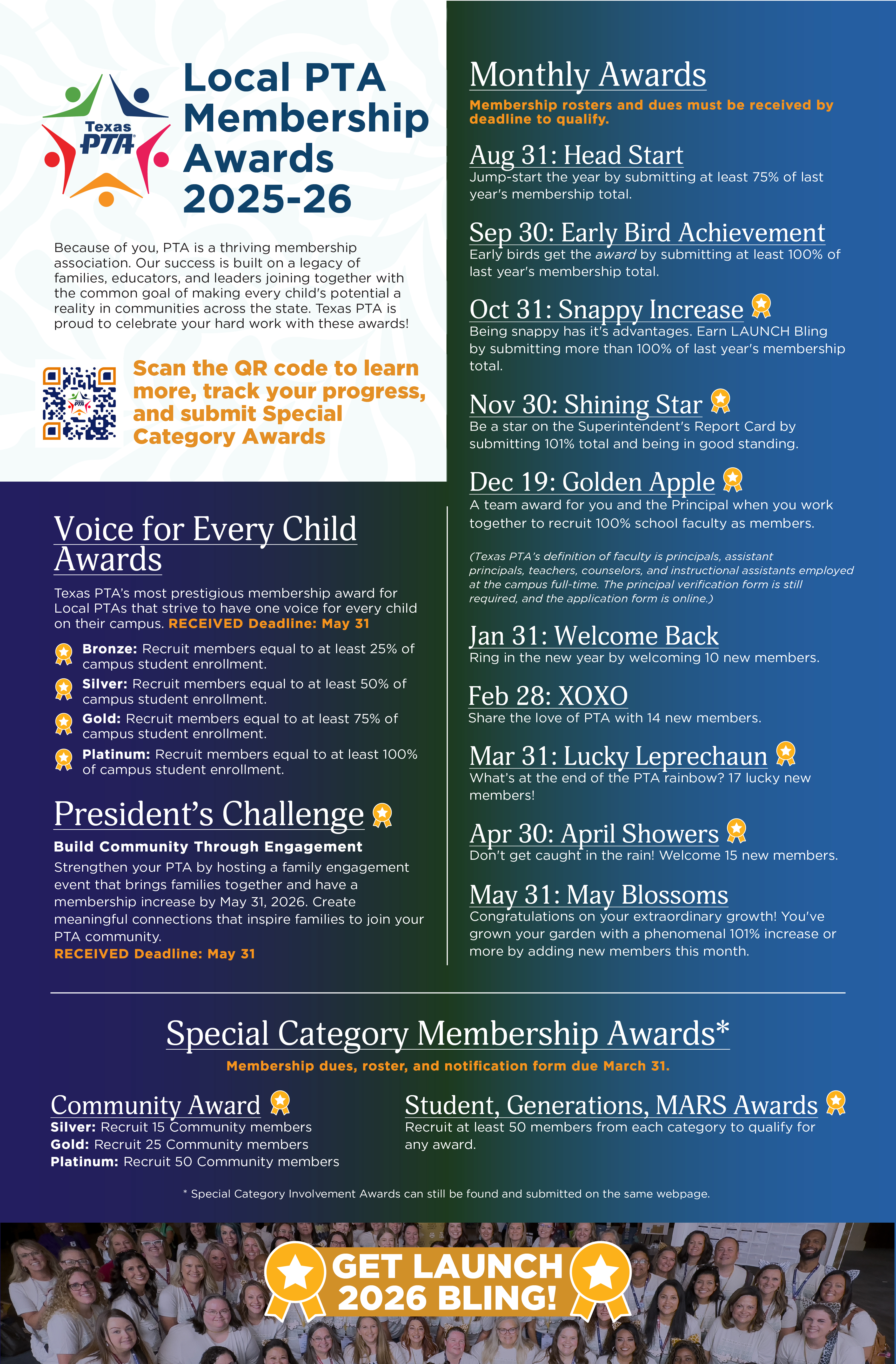 Click on the links below to complete a notification form for each special category award your PTA has earned. All forms will open on 9/15/25 and close on 3/31/26, so make sure to submit before the deadline!